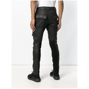 Black cotton blend skinny trousers from Rick Owens DRKSHDW featuring a low waist, a button fastening, a skinny fit, front pockets, rear flap pockets, a regular length, ribbed knee panels and an asymmetric cover flap with a hidden pocket and button fastening.