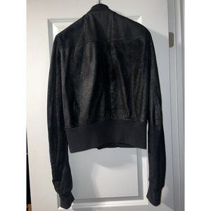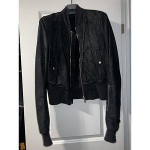 This black Rick Owen's cropped bomber jacket features a stand up collar, a front zip fastening, two front pockets, long sleeves and a zipped sleeve pocket. This bomber is perfect for layered over casual looks.