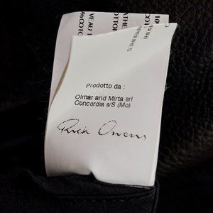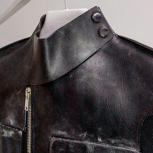 A stylized take on a black leather motorcycle jacket from Rick Owens featuring A thick, structured leather double-snap secured collar and shoulder yoke panel that runs down the front off-centre oversized silver-tone zipper closure, a heavy yet supple pebbled leather body with 3 zippered pockets, and thin calfskin leather sleeves with finely knit wool rib to add stretch for ease of wear.