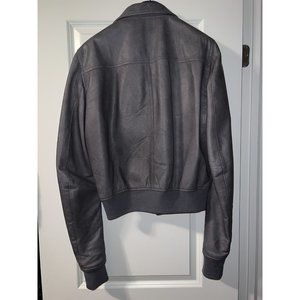 This grey leather bomber jacket is crafted from calfskin and features an asymmetric style, a front zip fastening, long sleeves, a ribbed hem and cuffs and two chest pockets.
