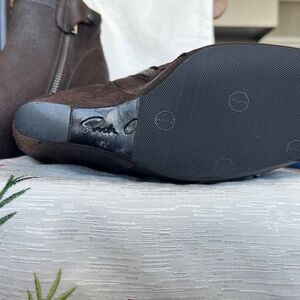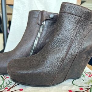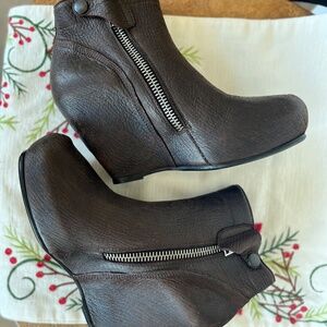 Genuine chocolate-brown leather with worn effect. Size 8, wedged heel, side zipper and a top closure. Worn 3 times in an excellent condition