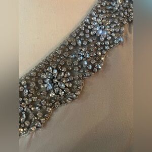 This gorgeous one shoulder evening dress will be the center of attention of every room! This dress features a statement crystal detail, ruffle and ruching along the shoulder! The flowy fabric elevates the already flattering silhouette of the gown. In excellent condition!