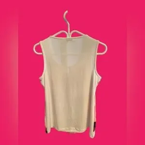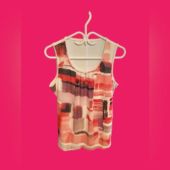 Sleeveless printed blouse. Scoop neckline, keyhole with one button closure on front. Pleating on frontside as well. Very stretchy gently used. Pit to pit 19”
