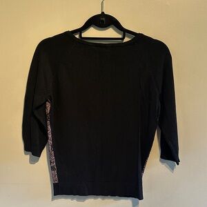 Chic sweater with floral design. Features black sleeves. Ideal for versatile styling.