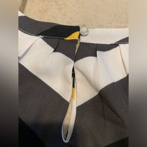 This stylish halter-neck blouse from Ricki's is perfect for a chic and professional or smart-casual look. The top features a bold chevron stripe pattern in black, white, gray, and a pop of yellow. The high-neck halter style is elegant and sophisticated. The lightweight fabric drapes beautifully, making it comfortable for warmer weather. It's a versatile piece that can be paired with trousers for the office or with jeans for a night out. This blouse is a size XL and is in excellent, gently used condition.