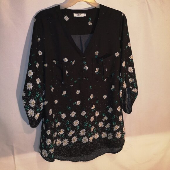 Ricki's Ladies 3/4 Tab Sleeve Black Flowered Pattern Blouse / Tunic