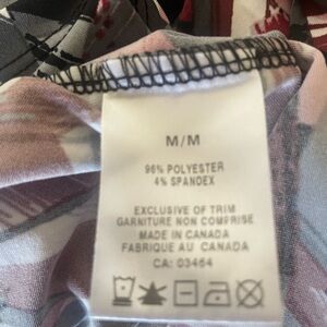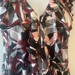 Stylish V-neck blouse with an abstract pattern. Features a mix of red, black, pink and cream tones. Perfect for versatile wear. Sleeveless. Measures: 19.5” pit to pit and 26” in length from top of shoulder to bottom hem. Polyester material with a bit of spandex for great fit and comfort. Lovely ruffled neckline with ruffle extending around back of neckline. Falls very nicely. See photos for washing instructions.