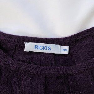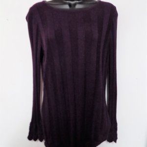 This sweater is a size large and the material is 59% rayon and 41% cotton. It measures 26" long, and 34" around the bust measured flat and unstretched. The sweater is in good condition with only minor signs of wear (i.e. minor pilling). It has been kept in a smoke free home.