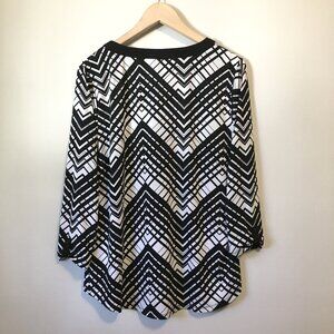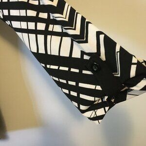 Very good preowned condition, black and white steady geometric zigzag pattern, 3/4 sleeve with tabs and black trimmed tunic shirt by Ricki's. This shirt really reminds me of the 90s and something one of the band members of the Smashing Pumpkins would wear. Not a true tunic, but has a tunic look that was popular in shirts produced in the 70s and revived in the 90s for a short time.