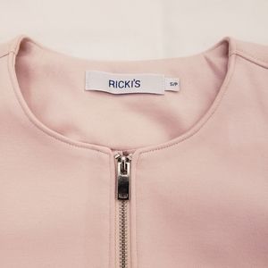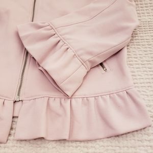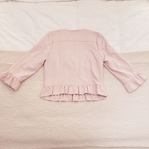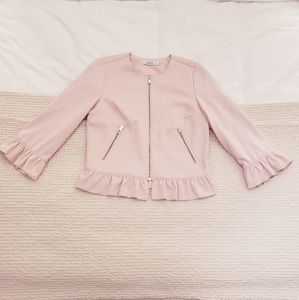Ricki's cropped zip-up, fully lined blazer/jacket. Soft stretchy comfortable fabric. Beautiful ruffled detailing in a gorgeous light pink colour. Size S. NWOT, never worn, excellent condition. Versatile; pairs well with pencil skirts, pants and high-waisted skinny jeans.