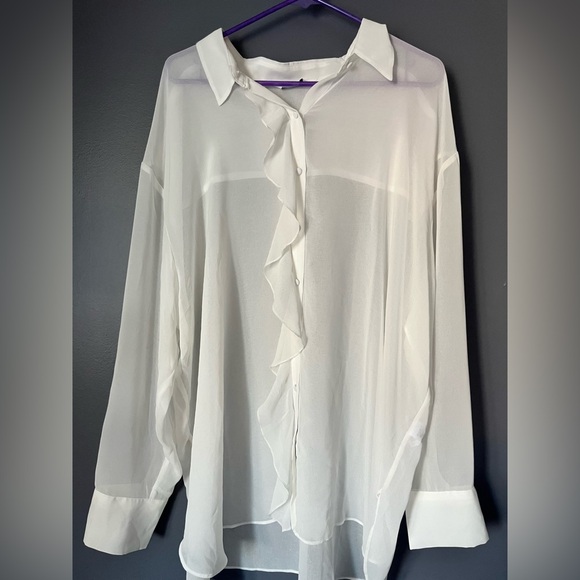 Chic sheer blouse with ruffle detail. Button-up front. Perfect for layering. Like new. Tried on but never worn