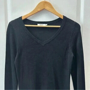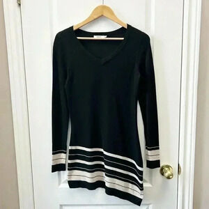 Ricki’s Tunic Sweater Asymmetrical Hem V Neckline Black Tan Stripes Size XS
