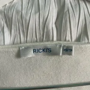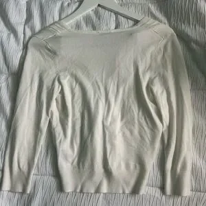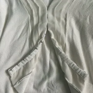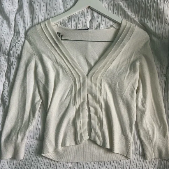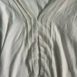 Lightweight white V-neck sweater with layered ruffle trim down the front. Three-quarter sleeves and a slightly cropped hem. Soft knit for everyday wear and easy layering.