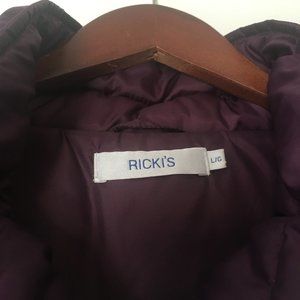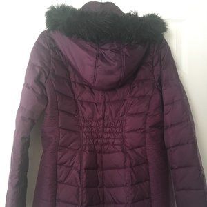 Royal Purple Puffer Coat with ruched sides. Removable hood which has black faux fur trim. Very warm. Selling as too small on me.