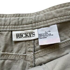 Vintage Ricki's women's shorts in a khaki beige 100% cotton. Pockets at sides of hips plus pockets with hook & loop closures at sides of legs. (No back pockets.) Zip fly with adjustable drawstring at waist. Tag size is women's "XL" - see below for garment measurements.