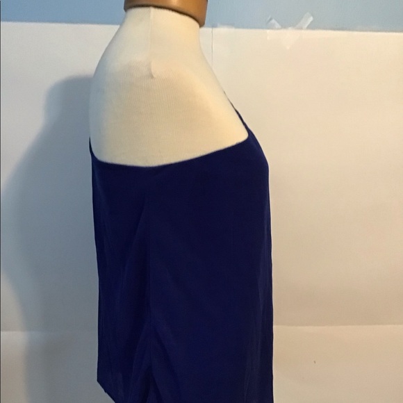 Beautiful royal blue sheer blouse/top with under lining. This top has only one shoulder/arm hole, so the other shoulder is bare. Very stylish bat-wing sleeve on one side as well as beautiful beaded design. Looks great dressed down with jeans or dressed up for a night out! In excellent condition. See pics for measurements.