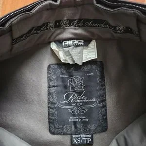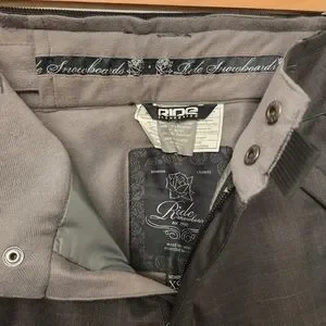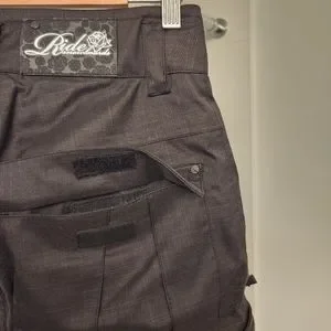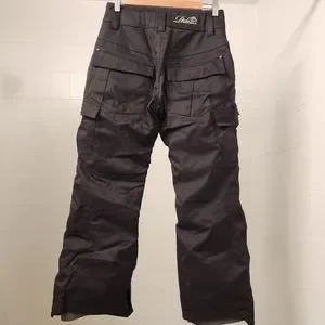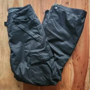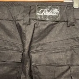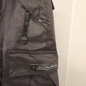 Ride snowboard pants. Waterproof, breathable. Inside leg zip-vents, double velcro back pockets, cargo pockets and two front zip pockets. Snap buttons and zip fly, with soft lining at waist. Good preloved condition.