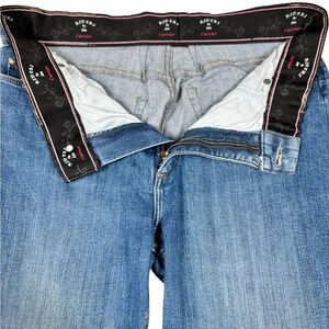 Excellent preowned condition, size 34” Waist, 11” Raise; 28” Length; 9” wide bottom hem