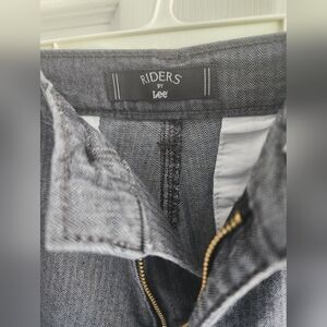 Riders by Lee in a Charcoal Gray with a Herringbone pattern. No s8ze or care tag but I believe they are a size 12. see measurements below.