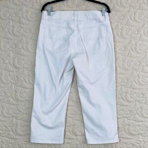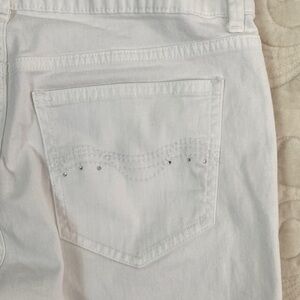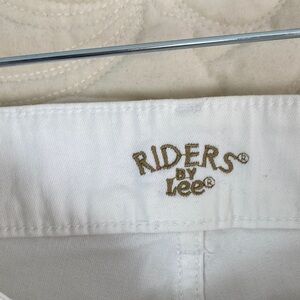 Riders by Lee White Capri Pants. Women's tag size 10 (see actual measurements in photos). Cotton, spandex blend. White. Mid Rise. Back pocket rhinestones.