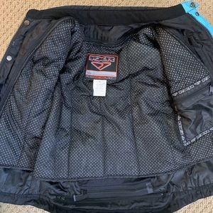 FXR motorcycle jacket with shoulder and elbow pads. Inside liner is removable. Used only to take the course. Extremely good condition. Doesn’t fit me anymore. Gloves included. Never ended up buying a motorcycle.