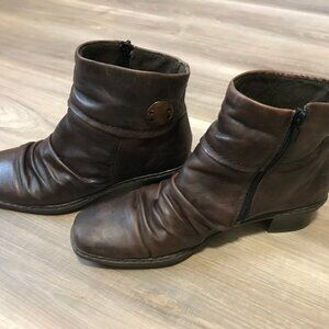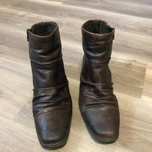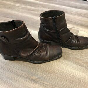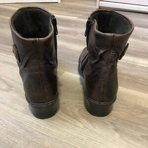 Stylish brown leather ankle boots with a side button detail. Perfect for any occasion.