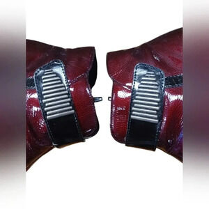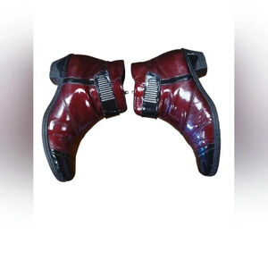 Shiny red with black toes, these ankle boots feature round toes and side zipper closures with decorative strap.