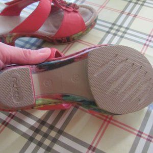 Stylish Rieker sandals with vibrant red straps. Features a unique floral design on the heel. Perfect for adding a pop of color.
