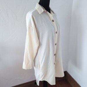 Rifle Paper Company Floral Trim Wool Blend Long-Line Button Up Tunic Off White