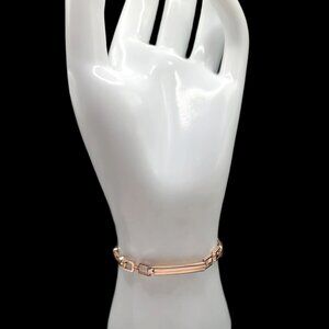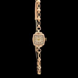 All original with buffing & polish & small extension in bracelet for sizing, Rima Swiss ladies analog watch featuring 10k rose gold plated case & 20-12k rose gold filled bracelet and 7-Jewel wind up mechanical movement in excellent running condition. Case 17mm Band 4mm. Current band measures 7" closed and has an expansion clasp that expands to a resting 7.5". For up-sizing or precise sizing or free bracelet change, please message me.