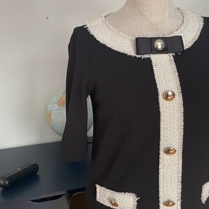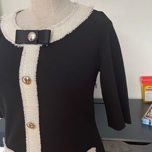 Elegant black mini dress with white accents. Features button details and short sleeves. Perfect for chic occasions.
