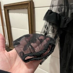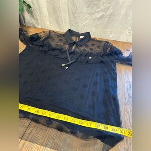 Elegant sheer black blouse with polka dots and frill details across the chest and sleeves. Satin collar with tie-neck closure. The body is lined for coverage while the sleeves remain sheer.