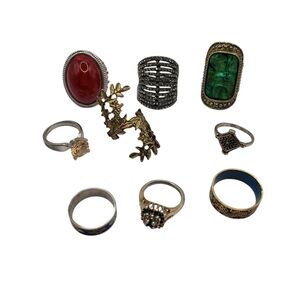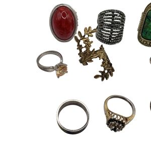 Bundle of 9 rings different sizes. Dinner rings, bands, solitaire and cluster style.