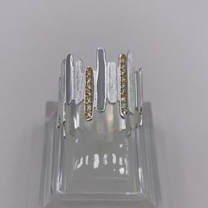 New item without tags. A most interesting ring in real 925 sterling silver with 22 Karat gold plated accents hand made by skilled artisans. Triangular origami fold look of the cigar band type ring brings an edgy newness. Most of the fold surfaces are a shiny finish but 2 folds are applied with real 22 Karat gold in a brushed finish for drama. A great way to integrate your existing gold and silver together. Adjustable in size due to the open band: simply gently spread to correct fit. Add any complementing pieces found in Our Closet (some suggestions shown all listed and priced separately) to really amp up the look. This is how we get Fresh at Lemon Squeezy Shop🍋