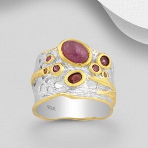 New item, no tags. Solid 925 sterling cigar band ring with touches of 22 Karat gold and real rubies and unusual orange sapphires (as described by manufacturer but reads more pinky purple-see photos). Dramatic and unusual! Size 7. Organic, raw texture on band for boho styling but elevated with the real gems and gold when opting for a more cultured sophisticated look. Big look, enough to build an entire look around. Hand made in Taiwan by skilled master craftsmen with great attention to detail and finish. Real jewellery with a contemporary flair. Add some finishing touches with coordinating pieces from Our Closet (some suggestions shown all listed and priced separately). This is how we get Fresh at Lemon Squeezy Shop🍋