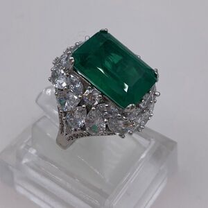 STUNNING! New item, no tags. Substantial, spectacular, solid 925 sterling silver setting holds this imperial sized, created emerald of a classic cut, set in a exquisite raised, filigreed and pierced gallery, allowing light to pass through for truly dazzling sparkle. Lab created gems have all the properties and appearance of natural gems, without the astronomical price tag. Surrounded by full cut, scintillating and sparkling AAAAA cz gems of superb clarity and colour treated masterfully by skilled craftsmen showcasing the quality of the gems. Size 7. Regal and rich look for all your Red Carpet worthy looks. Complete your parure with additional pieces and accessories from Our Closet (some suggestions shown, listed and priced separately), or dazzling all on its own. Show them how, show them Wow, from Lemon Squeezy Shop 🍋