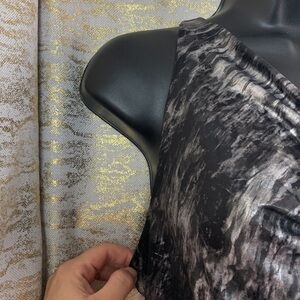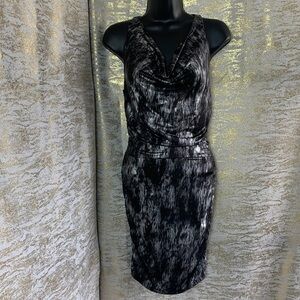 - Gorgeous Figure flattering cocktail dress. It is grey and black with shimmery silver throughout. stretchy,soft and comfy