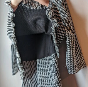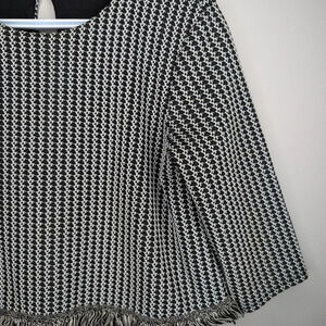 The black and white tweed-style fabric creates a classic look with a touch of texture, while the eye-catching fringe detailing adds a touch of movement and fun.