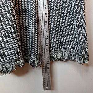 The black and white tweed-style fabric creates a classic look with a touch of texture, while the eye-catching fringe detailing adds a touch of movement and fun.