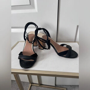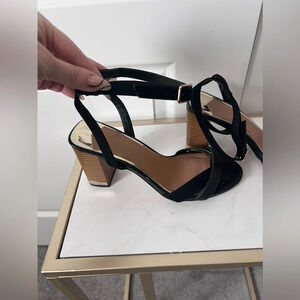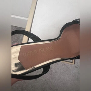 River Island | Open Toe Black/Wood/Gold Block Heels | Size 8 (Fits like 9-9.5)