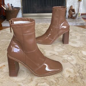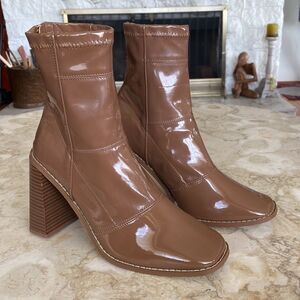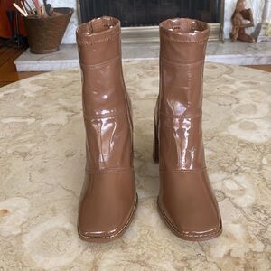 Cute River Island sleek patent square toe block heel sock ankle boots. Back zipper, great neutral beige/nude tone.