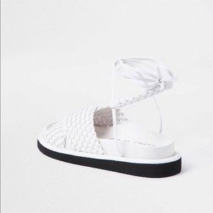 White faux leather weave ankle tie sandals