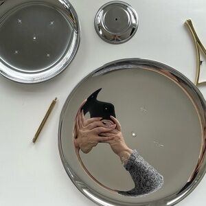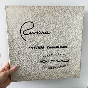 Original box and instructions comes with Riviera # C -128. Chrome Two Tiered Tidbit Tray. Atomic design.