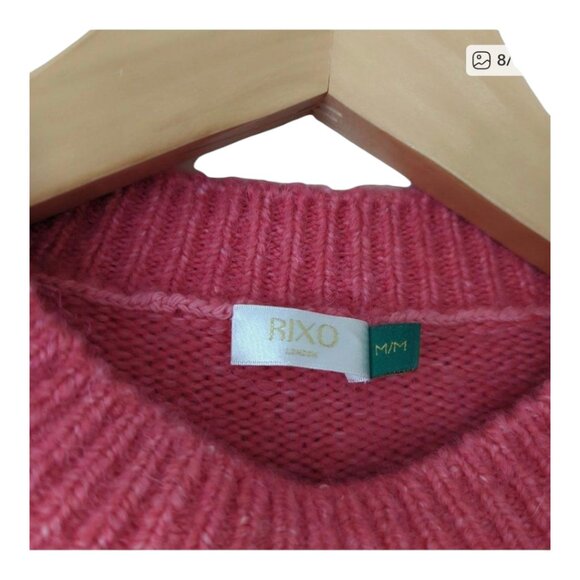 This is a balloon sleeve pullover sweater by Rixo London. Made from a pink mid-weight brushed knit with allover black embroidered hearts.