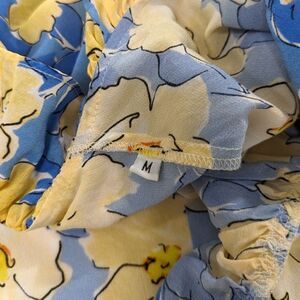 Happy sky blue & yellow floral silk crepe print. Ruffled neckline & hemline with oversized smocked elbow length sleeve. Perfect design for a wider shoulder like myself!