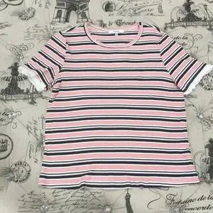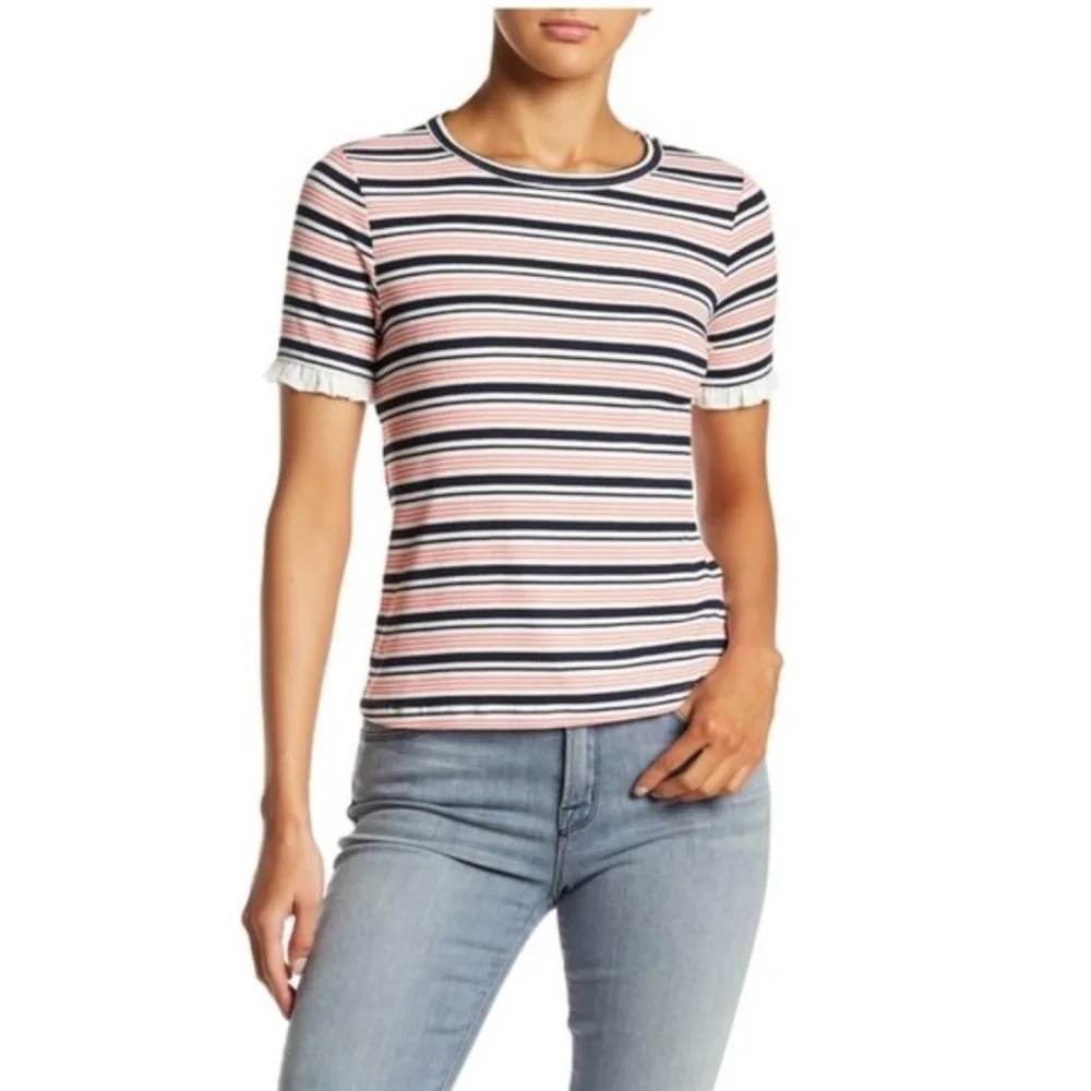 A striped short sleeve ruffle trim blouse tee is the next addition to your closet.