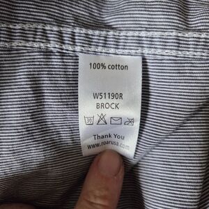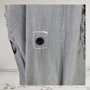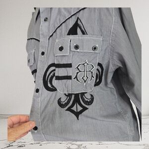 Casual gray shirt with bold black embroidery. Features button-down front and chest pockets. Ideal for everyday wear. * is missing bottom button Length 30" Bust 40" Sleeves 25"