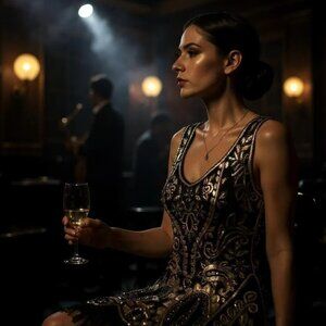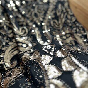 Step back in time with this glamorous 1920s-style dress, featuring shimmering gold sequins and elegant black fringe detailing that capture the essence of vintage evening fashion. Perfect for themed events or costume parties.