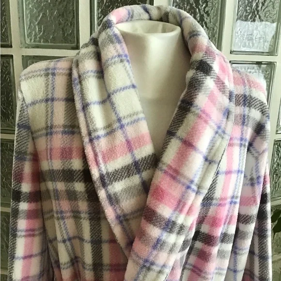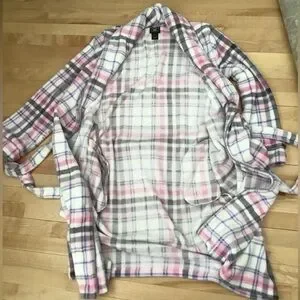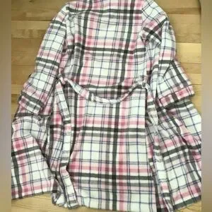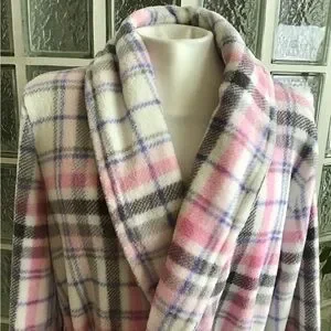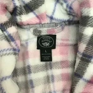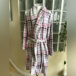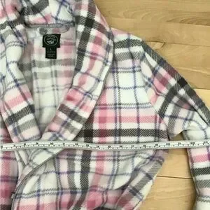 Like new, never worn, soft, with some stretch, so comfortable, I had bought two of these robes, tag says large, fits like medium.