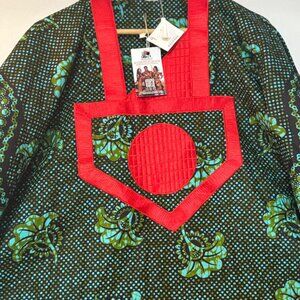 Découvrez ce kaftan vibrant en tissu wax, parfait pour un style unique et culturel. Un mélange de vert, noir et rouge, créant un motif accrocheur et dynamique.